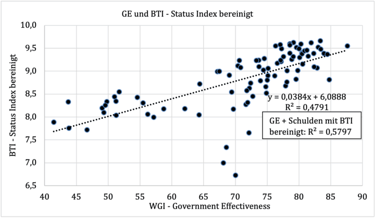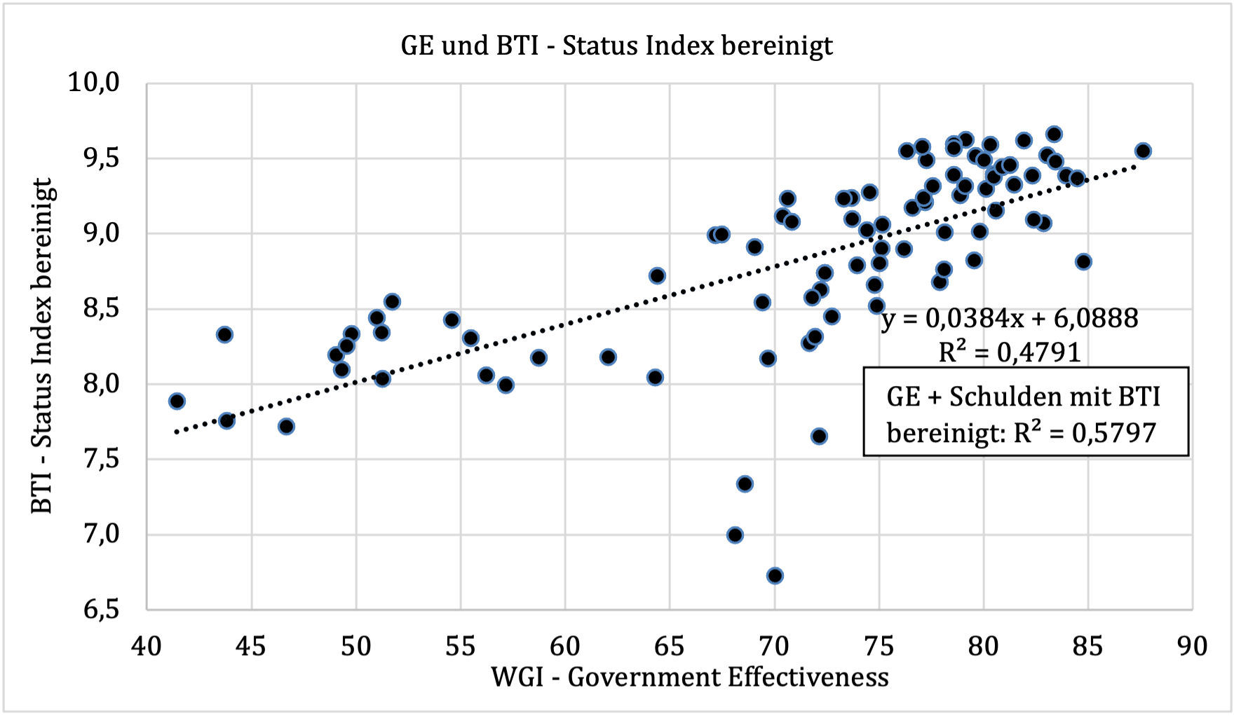 Das Bestimmtheitsmaß (R²) ist bei der Verschuldung unkorreliert (R² 0,0059). Hinsichtlich der Verwaltungsqualität ist dies anders. Die Korrelation des GE zeigt ein R² von 0,48, beide unabhängigen Variablen zusammen ein R² von 0,58. Der erklärte Anteil der Varianz der abhängigen Variable beträgt beim unbereinigten BTI 0,61. Der Wert und die Güte des Regressionsmodells liegen damit im mittleren Bereich. Das statistische Modell erklärt somit einen größeren Anteil der Varianz der abhängigen Variable sowie 61% und nach Bereinigung 58% der Variation der Index-Werte des BTI. Die Unterschiede nach Bereinigung sind zu vernachlässigen. Die Bereinigung zeigt, dass keine signifikanten Änderungen einhergehen und die Gefahr einer Tautologie nicht wie vermutet auftritt.