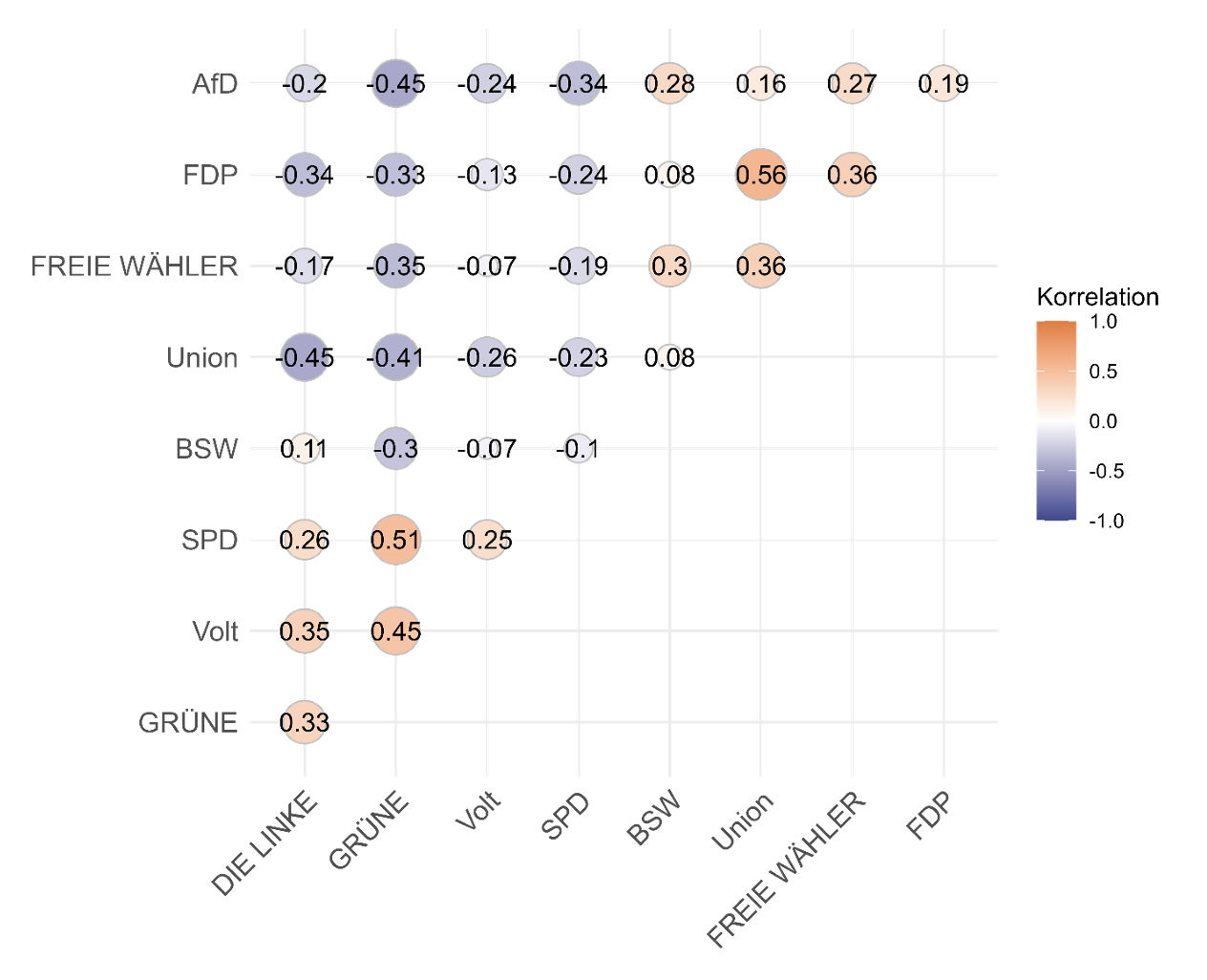Da es sich bei der Wahlwahrscheinlichkeit um eine metrische Variable handelt, können Korrelationen berechnet werden. Auf diese Weise kann analysiert werden, wie stark die berichtete Wahlwahrscheinlichkeit für eine Partei positiv oder negativ mit der berichteten Wahlwahrscheinlichkeit für eine andere Partei einhergeht. Die Ergebnisse sind in Abbildung 1 zusammengefasst. Rote Farben stehen dabei für eine positive Korrelation und blaue für eine negative. Die Größe der Kreise und die Stärke der Einfärbung zeigt dabei die Stärke des Zusammenhangs an. Alle Zusammenhänge sind statistisch signifikant.