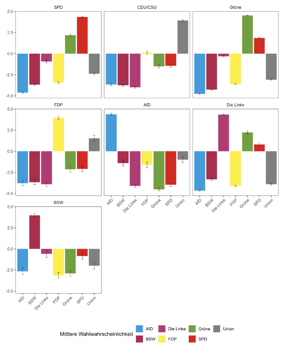 Auf den ersten Blick sind bereits positive und negative Durchschnittswerte gut erkennbar. Wenig überraschend sind die Grünen für SPDler die Zweitpräferenz und die SPD für Anhängerinnen und Anhänger der Grünen. Ein interessantes Bild ergibt sich bei der Union und der FDP: Wer als Wahlabsicht FDP angegeben hat, berichtete durchschnittlich eine relativ hohe und positive Wahlwahrscheinlichkeit für die Union. Umgekehrt gilt dies in einem deutlich schwächeren Maße: Unions-Anhängerinnen und -Anhänger haben die FDP zwar in der Regel als Zweitoption im Hinterkopf, aber die Wahlwahrscheinlichkeit wird durchschnittlich nur mit 0 auf der Skala von -5 bis +5 angegeben. Kurzum, die FDP gilt hier als ein geringeres Übel für Unionsanhängerinnen und -anhänger, ohne als ernsthafte Wahlalternative wahrgenommen zu werden.